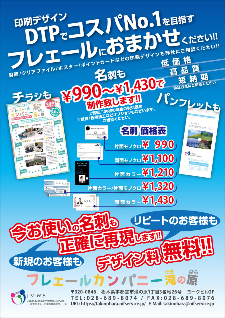 名刺もチラシもおまかせください!名刺もチラシもおまかせください! フレェールカンパニー滝の原では、DTP(パソコンを使った印刷物の制作)を利用者の作業のひとつとして行っています。名刺、チラシ、パンフレットなど各種印刷物のデザイン・印刷のご注文を承ります